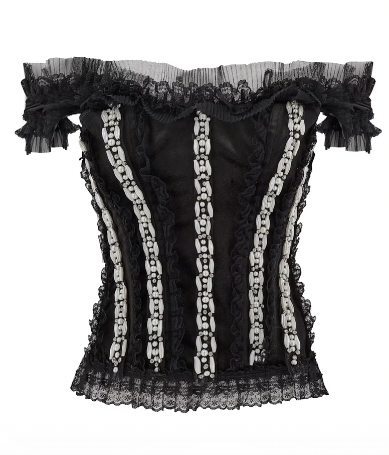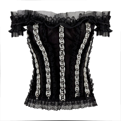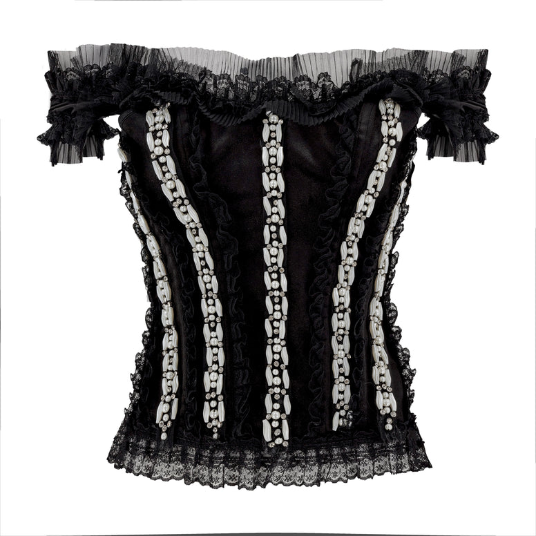 Timeless elegance meets modern luxury in this exquisite French-cut corset. Crafted from plush black velvet, it offers a structured yet comfortable fit that sculpts and enhances the silhouette. Delicate French lace trim adds a romantic touch, framing the edges with intricate detail. Embellished all over with luminous pearls and sparkling zirconia stones, this corset is a true statement piece, radiating opulence from every angle. Perfect for styling with tailored trousers, flowing skirts, or layered over a sheer blouse, it’s a unique wardrobe staple that blends vintage allure with contemporary sophistication.