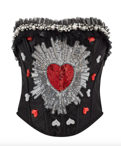 Turn up the heat with this captivating black corset, designed to blend sensuality with elegance. Hand-embellished with delicate French lace trim, the corset is adorned with lustrous pearls, playful heart-shaped sequins, and sparkling crystals for a touch of glamour. The structured design hugs your body, highlighting your curves with a flattering, chic silhouette. Perfect for those who want to embrace their playful side while staying effortlessly sexy and refined, this corset is a must-have for bold, stylish moments.