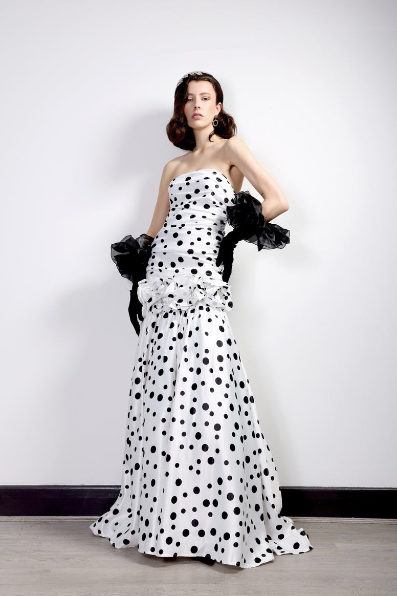 A striking balance of timeless elegance and playful sophistication, this strapless polka-dot gown reimagines classic couture with a modern edge.