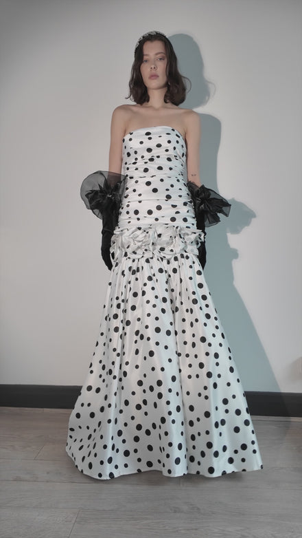 Crafted from a fluid, satin-finish fabric that catches light with every movement, the gown features a fitted bodice that gently sculpts the silhouette before cascading into a full, floor-length skirt. The monochrome polka-dot pattern adds a bold yet refined graphic element, while the gathered detailing through the waist creates soft texture and dimension. A subtle cluster of fabric rosettes accentuates the midline, adding a touch of romantic couture artistry.