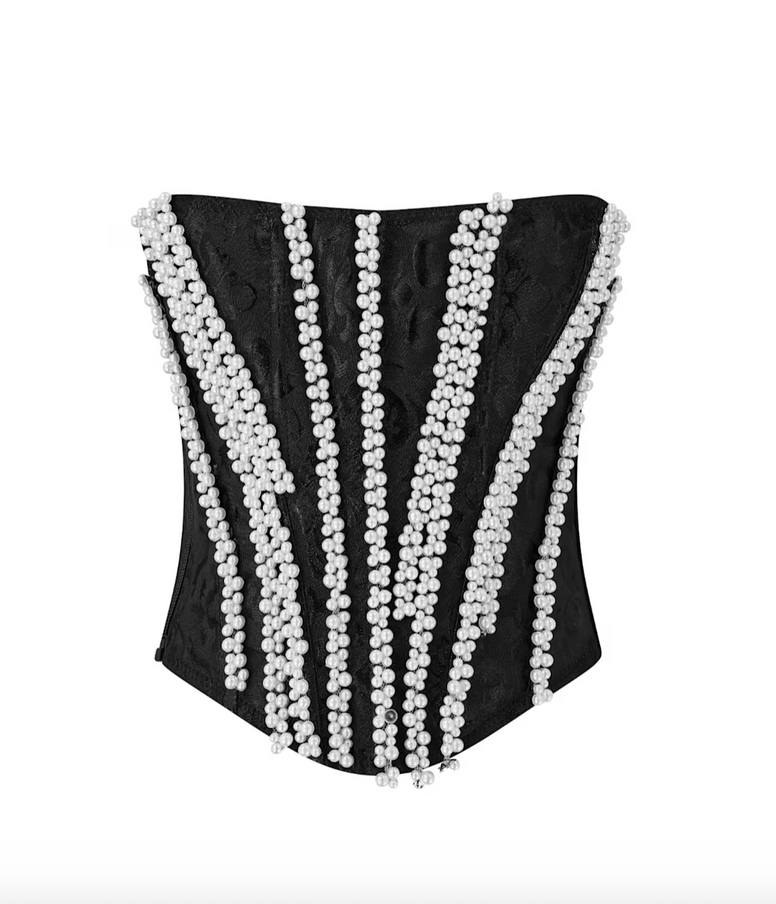 Unleash your dark elegance with our Gothic-Inspired Black Corset, a striking blend of avant-garde design and timeless allure. This captivating piece features a structured silhouette that beautifully contours your figure, while the asymmetrical pearl embellishments add an unexpected twist, creating a hauntingly beautiful contrast against the deep black fabric. The intricate tie detail at the back not only allows for a customizable fit but also adds a touch of classic corsetry. Perfect for those who dare to embrace their inner darkness with style, this corset is a statement piece that fuses gothic romance with modern edge, making it a must-have for any bold and fashion-forward wardrobe.