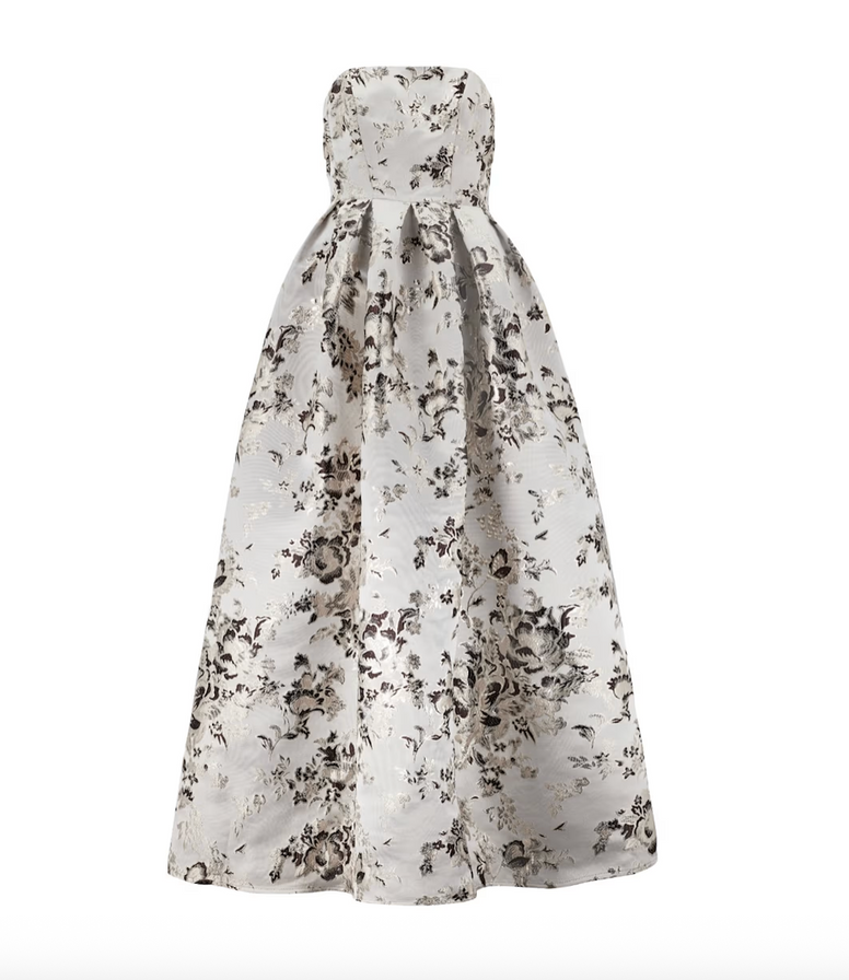 Inspired by the enchanting gardens of the 19th century, this strapless evening dress is a masterpiece of sophistication and timeless beauty. Crafted from luxurious silk jacquard, the fabric features intricate woven motifs that echo the romance and grandeur of Victorian landscapes. The strapless silhouette enhances the neckline with effortless grace, while the rich texture of the jacquard adds depth and dimension. Perfect for gala nights, formal occasions, or any moment that calls for refined elegance, this dress is a tribute to classic artistry with a modern touch.