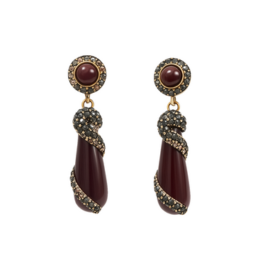 The Garnet Noir Drop Earrings bring a touch of dramatic elegance to any evening look. Crafted with deep burgundy resin drops, each earring is artfully wrapped in a spiral of pavé-set crystals that shimmer with every movement. The top is anchored by a round garnet-toned cabochon framed in antique gold detailing, adding a rich, vintage-inspired finish.