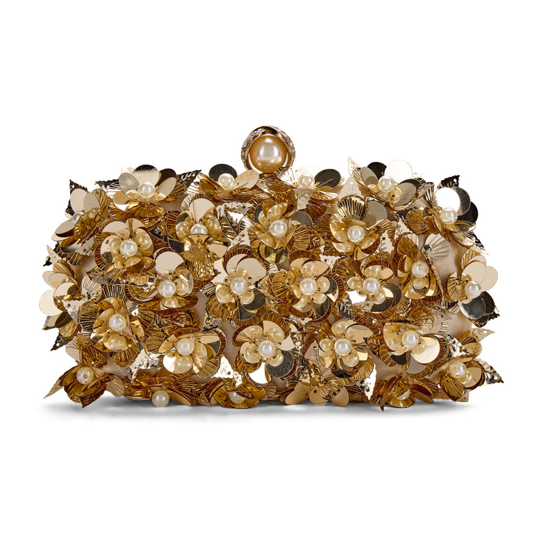 Crafted as a miniature sculpture, the Golden Petal Couture Clutch is a true statement accessory — opulent, intricate, and designed to mesmerize. Every surface is adorned with hand-assembled metallic florals, each petal sculpted in shimmering gold tones and finished with a luminous pearl at its centre. The result is a richly textured, three-dimensional garden that catches light from every angle.