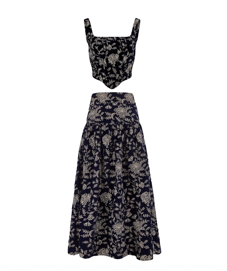 This luxurious two-piece set is a celebration of opulence, crafted from deep jewel-toned blue velvet and adorned with intricate golden embroidery inspired by the beauty of Victorian gardens. The structured corset top enhances the silhouette with a sculpted fit, while the high-waisted skirt flows gracefully, featuring discreet side pockets for a touch of practicality. Every stitch of the hand-embroidered golden threads adds depth and richness, making this ensemble a perfect choice for special occasions, evening events, or moments that call for timeless sophistication. A statement piece that embodies elegance and artistry.