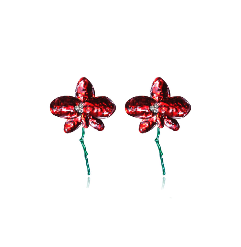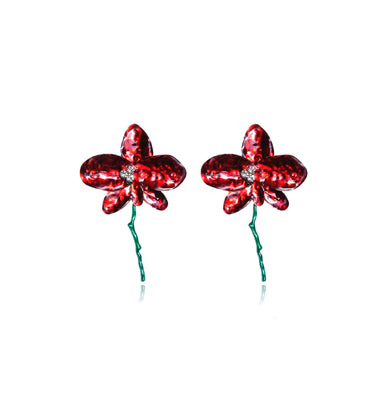 Each petal is meticulously designed to showcase graceful curves, enhanced by the marbled effect that adds depth and dimension to the bold red hue. Suspended elegantly in a drop style, these earrings are both dramatic and sophisticated, perfect for making a statement.