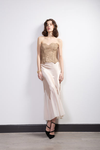 Cut on the bias to follow the natural lines of the body, the skirt drapes beautifully over the hips and flows into a gentle flared hem. The subtle sheen of the champagne satin catches the light with every step, creating a refined, liquid-silk effect. Diagonal seam detailing adds sculptural movement and enhances the skirt’s graceful silhouette, while the lower panel introduces soft volume for an airy, romantic finish.