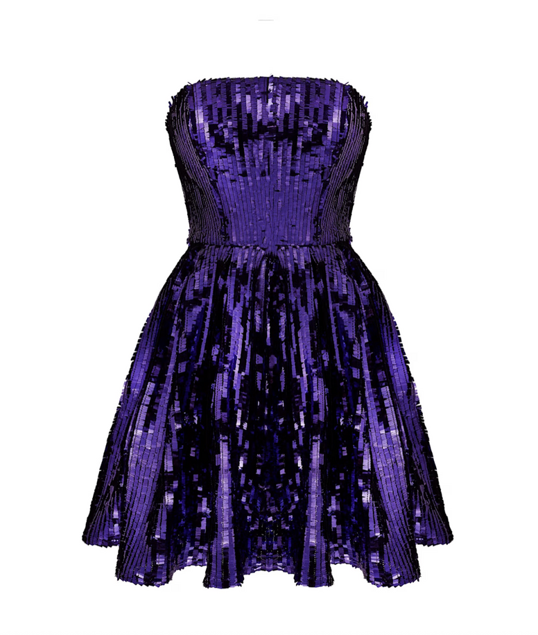 Make a bold, dazzling statement in this strapless mini dress, crafted from luxurious glass sequin fabric that catches and reflects light with every movement. The rich jewel-toned purple hue adds depth and drama, while the form-fitting silhouette highlights your figure with elegance. The seamless sparkle of the glass sequins brings a glamorous touch to this contemporary piece, making it perfect for evening events, cocktail parties, or any occasion where you want to stand out. With its luxurious feel and head-turning shine, this dress is a must-have for those who embrace modern glamour.