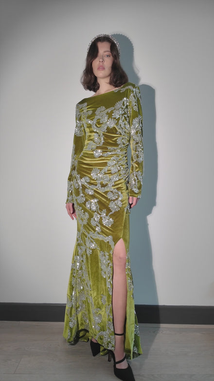 The design features a refined boat neckline and gently gathered detailing through the bodice, creating a soft draping effect that enhances the figure. Intricate silver floral embroidery cascades across the dress, adding a luminous contrast to the rich velvet base. A daring thigh-high slit introduces a touch of contemporary allure, balancing elegance with sensuality.