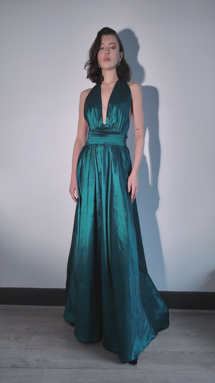 ffortless glamour meets fluid sophistication in this teal halter gown, designed to captivate from every angle.